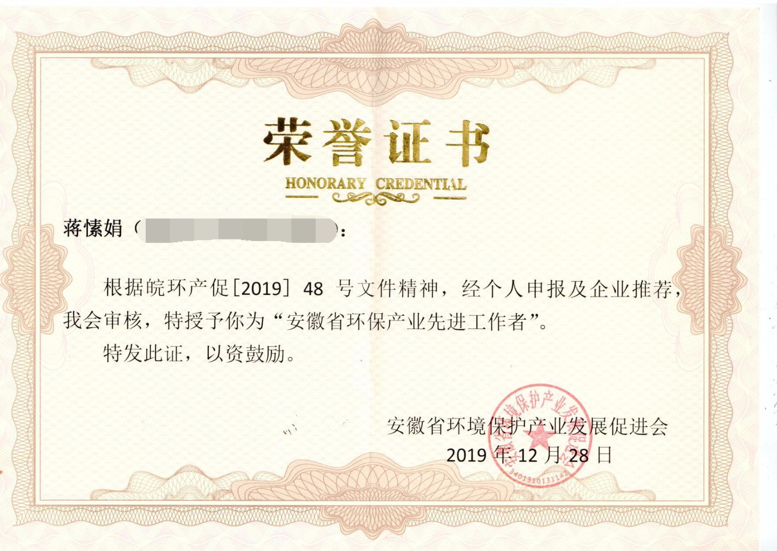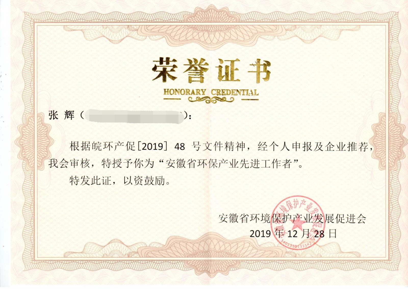 根據(jù)《關(guān)于申報2019年安徽省環(huán)保產(chǎn)業(yè)優(yōu)秀企業(yè)及先進(jìn)工作者的通知》(皖環(huán)產(chǎn)促【2019】第48號)文件精神,經(jīng)過我公司申請及安徽省環(huán)境保護(hù)產(chǎn)業(yè)發(fā)展促進(jìn)協(xié)會審核,我公司榮獲2019年度“安徽省環(huán)保產(chǎn)業(yè)優(yōu)秀企業(yè)”榮譽(yù)稱號,張輝同志、蔣愫娟同志獲得“安徽省環(huán)保產(chǎn)業(yè)先進(jìn)工作者”榮譽(yù)稱號。